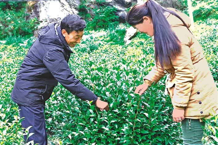 圖為勒門巴民族鄉(xiāng)茶葉農(nóng)牧民專業(yè)合作社理事長羅布次仁(左)和技術(shù)指導達娃卓瑪在查看茶葉長勢。 記者 段敏 攝