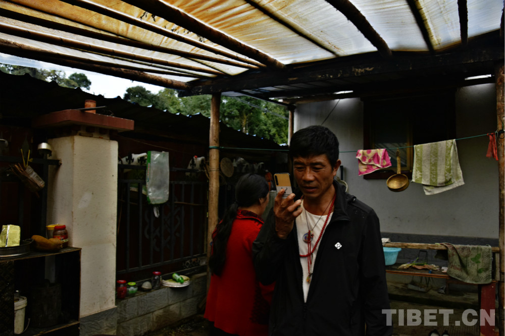 圖為西藏自治區林芝市墨脫鎮朗杰崗村村民高東在院中涼棚下接電話 攝影:王媛媛