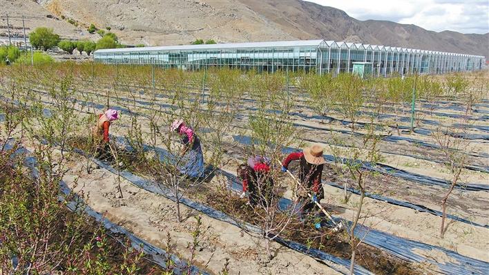 圖為當地群眾在卡如鄉大桃種植基地里干農活。記者 裴聰 格桑倫珠 攝