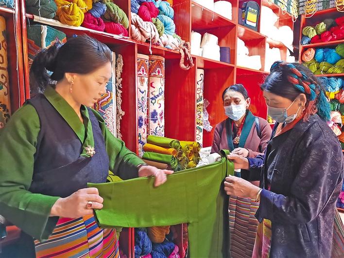 日喀則市仁布縣德吉林鎮德旦康薩傳統手工業農牧民專業合作社負責人旦真愛人(左一)正在向顧客展示產品。記者 扎西頓珠 攝