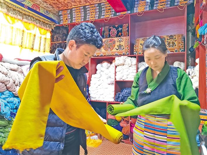 日喀則市仁布縣德吉林鎮德旦康薩傳統手工業農牧民專業合作社負責人旦真正在查看產品質量。記者 扎西頓珠 攝