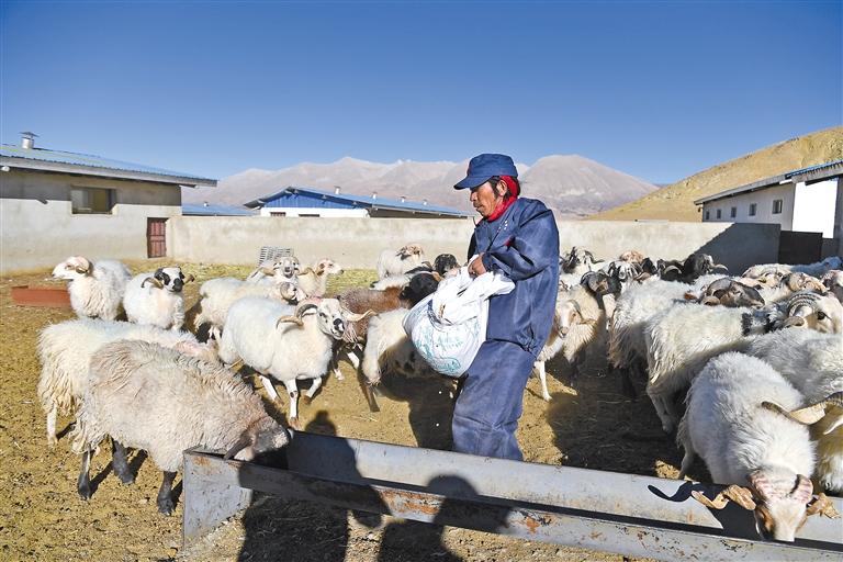 圖為聶拉木縣春都珠峰霍爾巴羊養殖農民專業合作社的社員正在飼喂綿羊。記者 李洲 攝