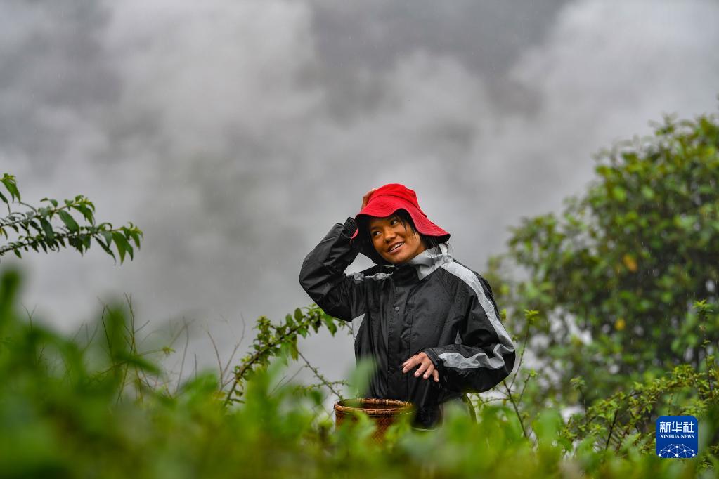 門巴族姑娘貢桑拉姆正在云霧繚繞的茶園里采摘茶青