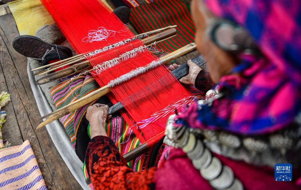 今年72歲的本央老人,是僜人服飾制作技藝西藏自治區級非遺傳承人。在西藏林芝市察隅縣沙瓊村,老人身著傳統的僜人服飾,在自家的涼亭里編織布料。