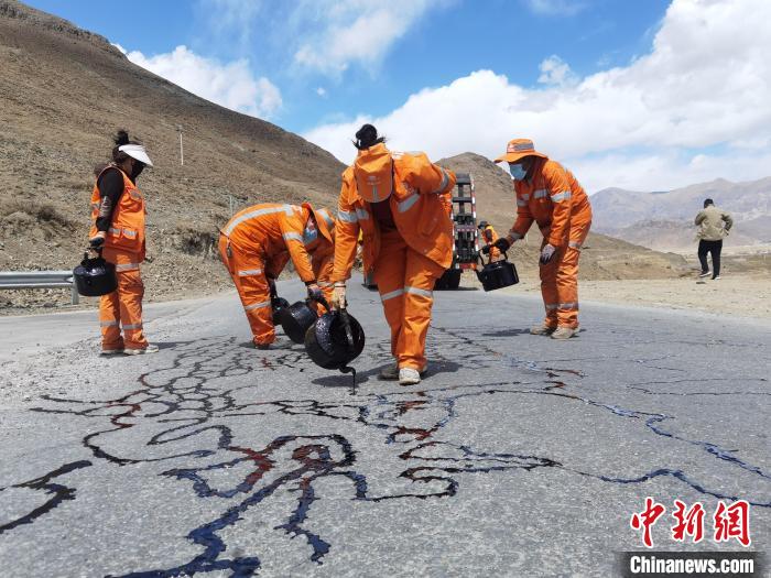 圖為在基層農村公路,女護路員正熟練地開展瀝青灌縫作業。 西藏自治區交通運輸廳供圖