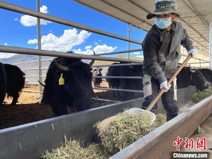 圖為拉薩市林周縣格桑塘現代農牧業產業示范園內,工作人員為牦牛準備飼料。 冉文娟 攝