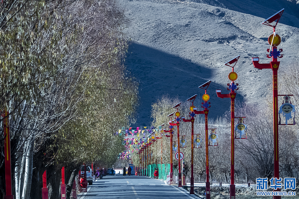 圖為扎西曲登社區街邊的藏戲主題路燈(12月9日攝)。新華網 旦增努布 攝