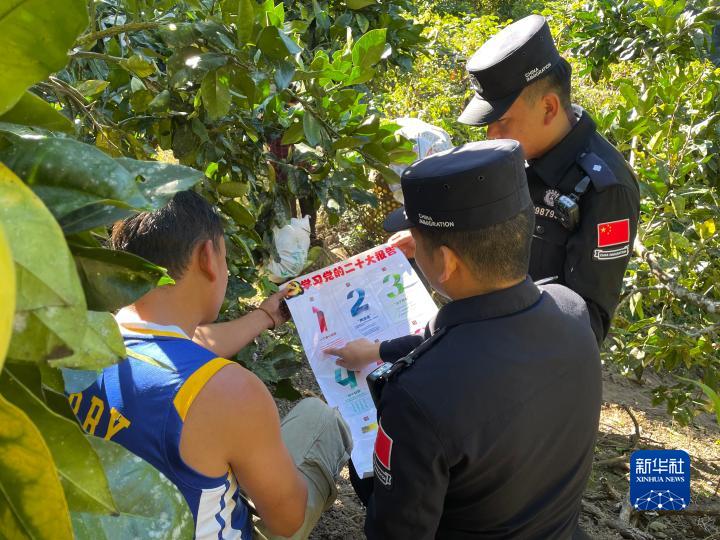 墨脫縣邊境派出所民警在墨脫鎮米日村蜜桔種植基地為群眾宣講黨的二十大精神。記者:李鍵、王澤昊 圖片由受訪者提供