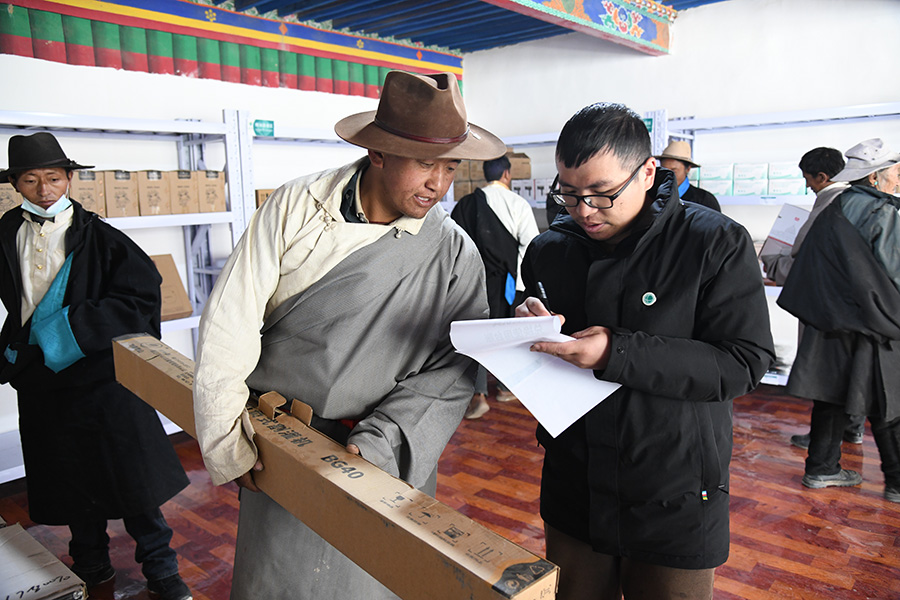 日喀則市昂仁縣多白鄉多白村村民在國家電網在藏首個“電力愛心超市”用積分兌換物品(3月30日攝)。國網西藏電力供圖 索娜央金 攝