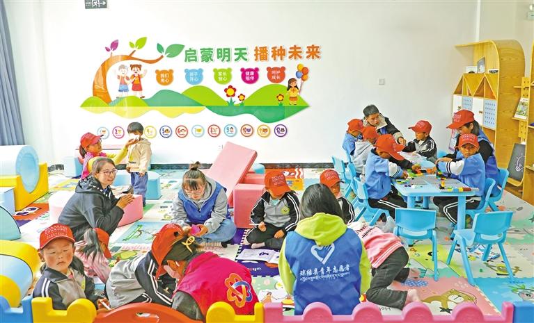 圖為志愿者陪伴瓊結縣加麻鄉昌嘎村兒童在該村日間照料中心婦幼兒童功能區玩耍。記者 劉楓 通訊員 熊起樊 攝