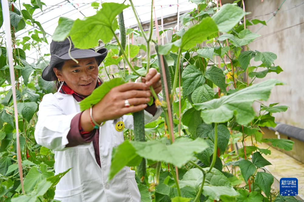 措勤縣高原生態畜牧業現代化養殖一體化產業綜合基地合作社社員白瑪在蔬菜大棚采摘黃瓜(8月19日攝)。新華社記者 張汝鋒 攝