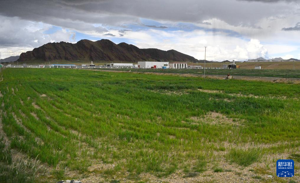 措勤縣高原生態畜牧業現代化養殖一體化產業綜合基地合作社人工草場和遠處的產業園區廠房(8月19日攝)。新華社記者 張汝鋒 攝