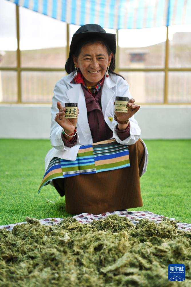 措勤縣高原生態畜牧業現代化養殖一體化產業綜合基地合作社社員展示產業園區特產——野蔥調味品(8月19日攝)。新華社記者 張汝鋒 攝