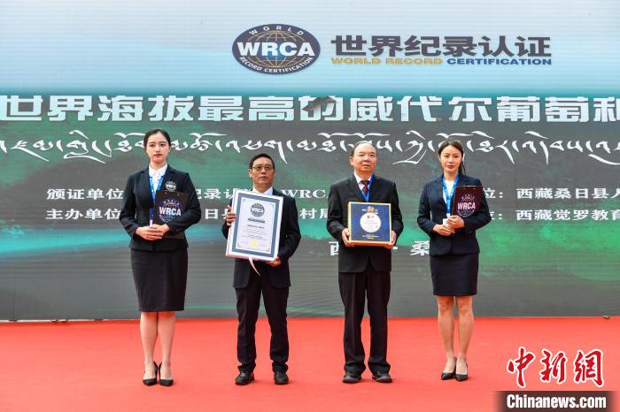 23日,經世界紀錄認證(WRCA)官方人員現場審核,西藏桑日縣被認證為“世界海拔最高的威代爾葡萄種植基地”。