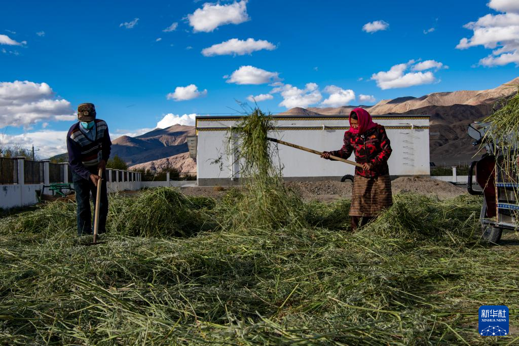 阿里地區噶爾縣昆莎鄉噶爾新村村民在場院晾曬紫花苜蓿(9月20日攝)。新華社記者 姜帆 攝
