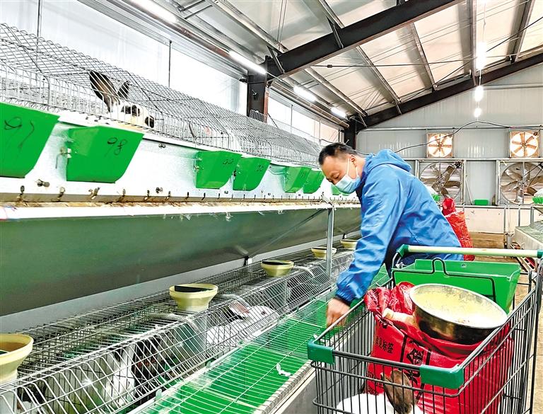 圖為拉薩市曲水縣才納鄉四季吉祥村獺兔養殖場的工人給兔子喂料。 記者 旦增蘭澤 攝
