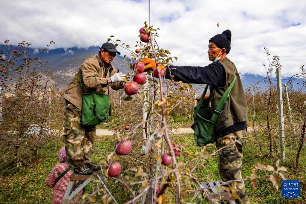米林市羌納鄉(xiāng)西藏林芝現(xiàn)代蘋(píng)果標(biāo)準(zhǔn)化園區(qū)內(nèi),農(nóng)民在采摘蘋(píng)果(11月13日攝)。新華社記者 姜帆 攝