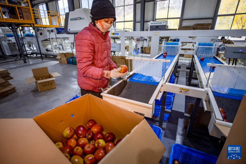 米林市羌納鄉(xiāng)西藏林芝現(xiàn)代蘋(píng)果標(biāo)準(zhǔn)化園區(qū)分揀車(chē)間內(nèi),工人在流水線上分揀蘋(píng)果(11月13日攝)。新華社記者 姜帆 攝