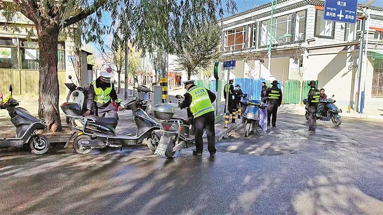 達(dá)孜區(qū)交警整頓非機(jī)動(dòng)車亂停亂放等違法行為。拉薩記者站 攝