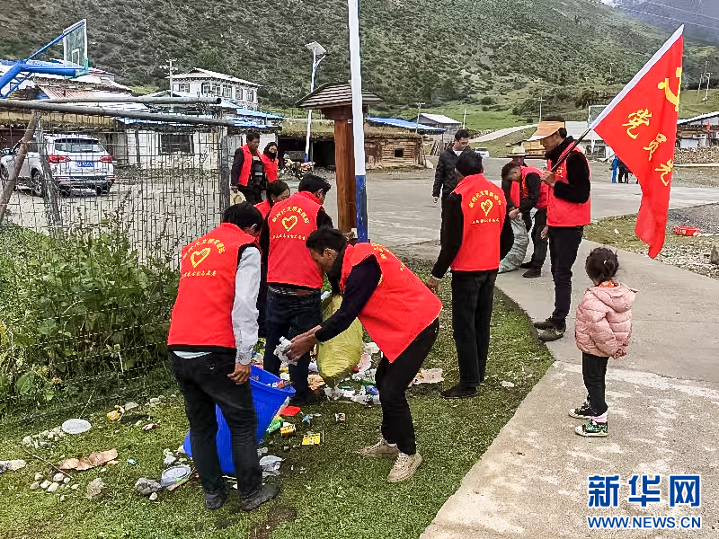 西藏昌都八宿縣然烏鎮來古村組織“冰川上的紅色家園”志愿服務隊開展環境整治活動(8月5日攝)。新華社發