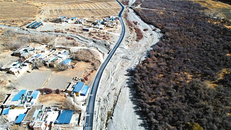 12月12日,山南市瓊結縣拉玉鄉鄉村旅游公路拓寬工程項目通車儀式在拉玉鄉白那村舉行。該公路長度為10.18公里,路基寬度為7.5米,屬于三級公路,總投資3500萬元。這條鄉村旅游公路的建成通車,不僅方便周邊村民出行,同時對開發當地鄉村旅游資源具有重要價值。 拉玉鄉鄉村旅游公路(無人機照片)。本報記者 白瑪澤旺 攝