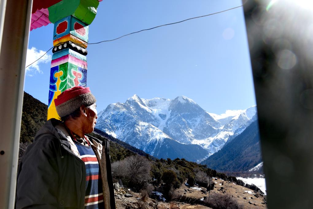 達瓦江村在自己的民宿二樓眺望梅里雪山群峰(1月5日攝)。新華社記者劉文博 攝