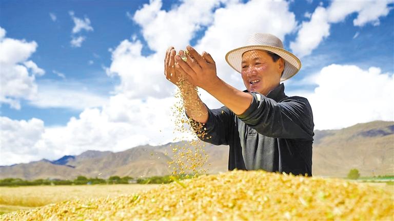 日喀則市白朗縣嘎東鎮(zhèn)馬義村村委會副主任普瓊手捧豐收的麥粒,高興地說:“高標(biāo)準(zhǔn)農(nóng)田建設(shè)為我們節(jié)省了大量的人力,實現(xiàn)了農(nóng)業(yè)機械化,讓未來的生活充滿了希望。”