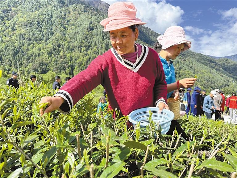 在墨脫縣格當鄉德吉村,茶農在采摘春茶。王凱 記者 王敏 攝