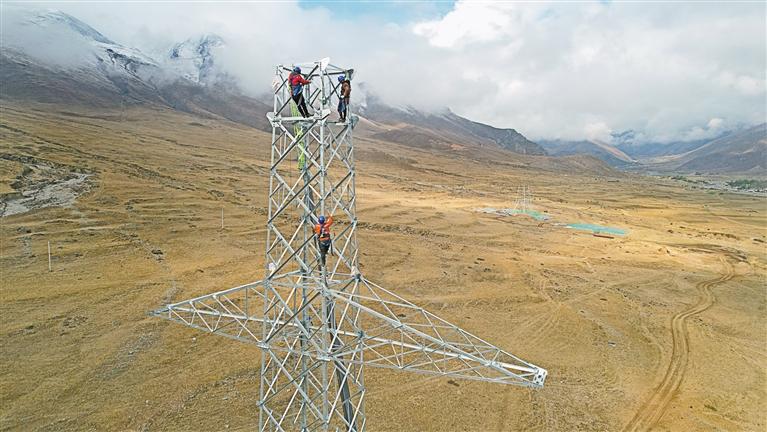 圖為工作人員在拉薩市林周縣色康村開展拉薩500千伏輸變電工程組塔作業。記者 格桑倫珠 攝