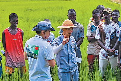 中國農業專家為科特迪瓦農民進行水稻病蟲防治的培訓。