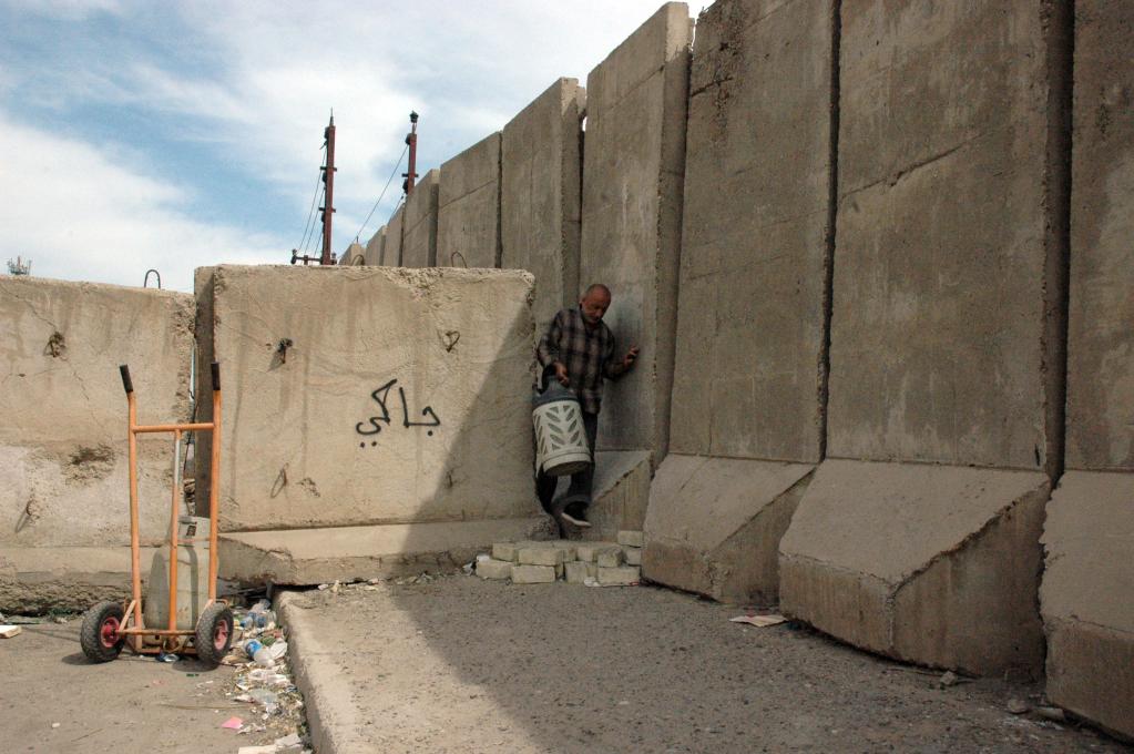2013年3月20日,在伊拉克首都巴格達,一名伊拉克人從防爆墻的縫隙之間穿過。新華社發(巴沙爾攝)