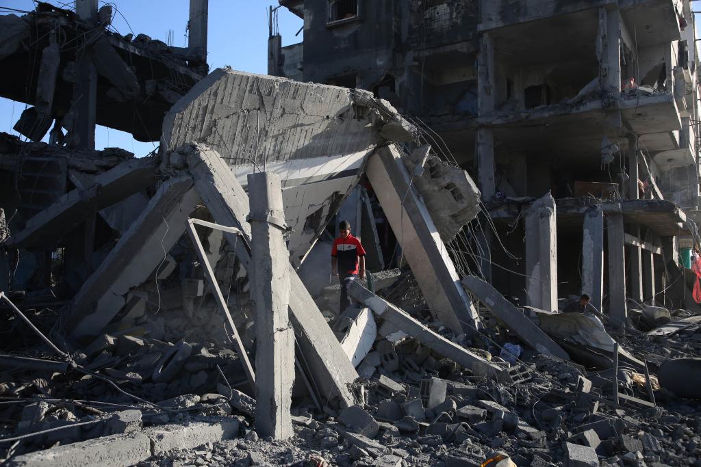 4月20日,在加沙地帶南部城市拉法,巴勒斯坦人查看被以軍空襲的建筑。新華社發(哈立德·奧馬爾攝)