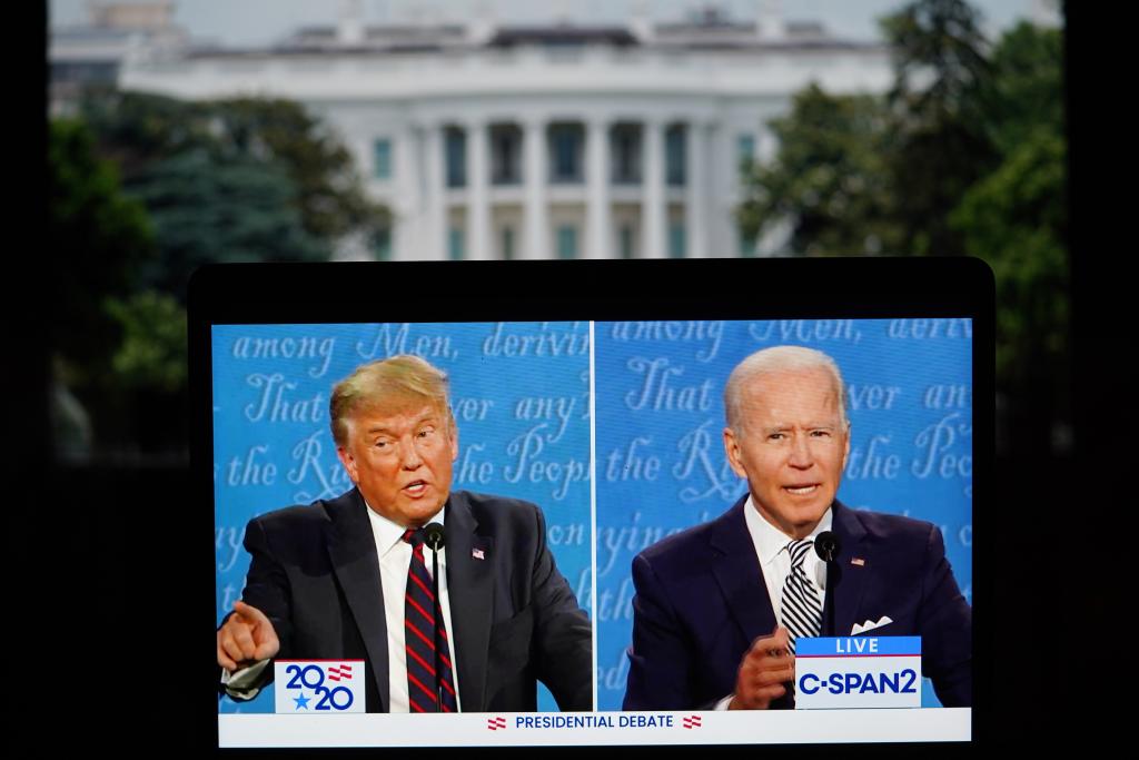 這張2020年9月29日在美國弗吉尼亞州阿靈頓拍攝的視頻畫面顯示,時任美國總統特朗普(左)與時任美國民主黨總統候選人拜登在俄亥俄州克利夫蘭市參加2020年美國總統候選人首場電視辯論。新華社記者 劉杰 攝