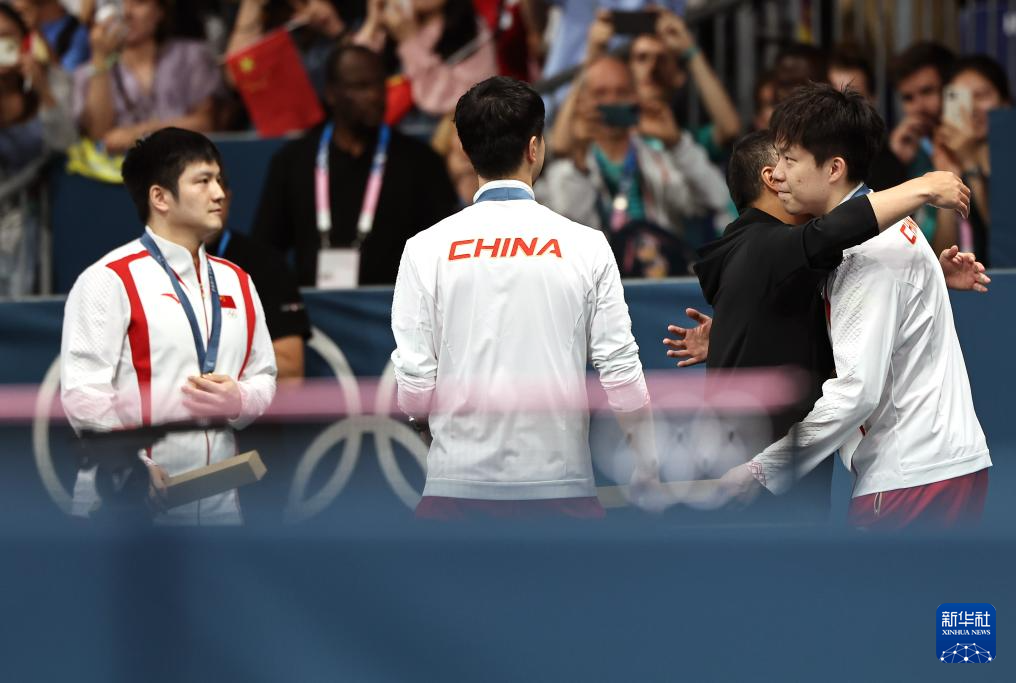 8月9日,冠軍中國隊(duì)選手王楚欽(右)在頒獎(jiǎng)儀式上與中國乒協(xié)主席劉國梁擁抱。新華社記者 王東震 攝