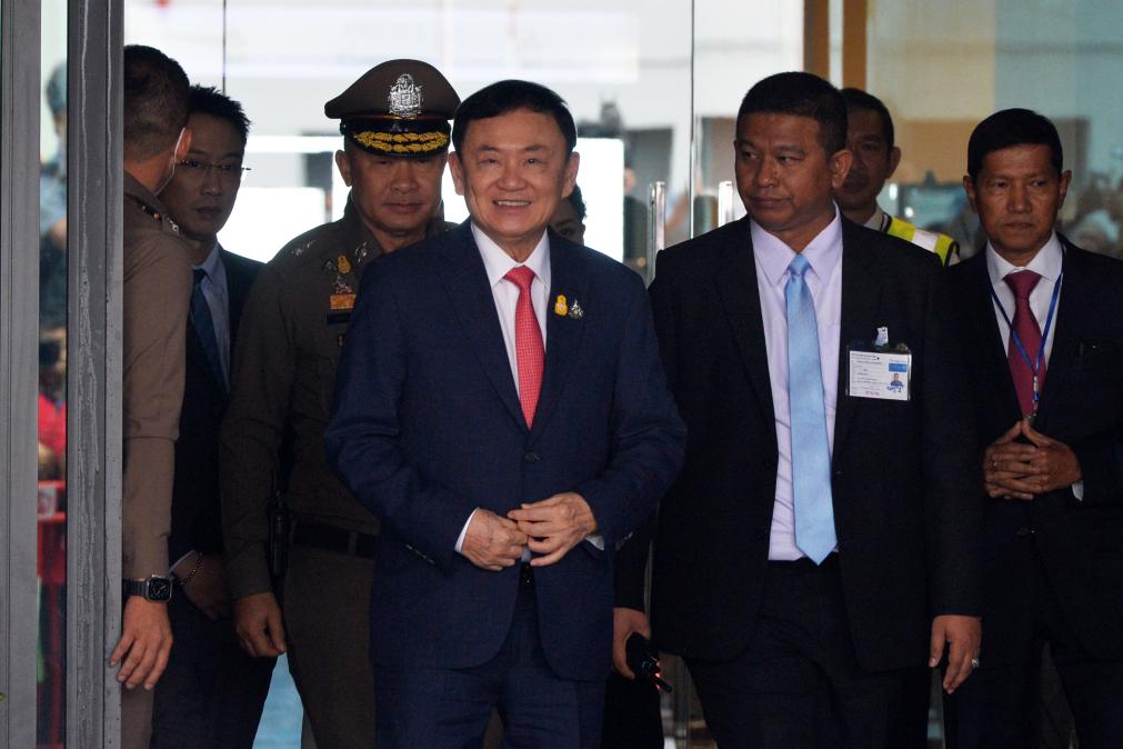 2023年8月22日,泰國前總理他信(中)抵達曼谷廊曼機場。新華社發(拉亨攝)