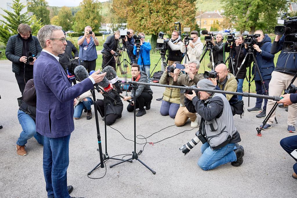 9月29日,奧地利自由黨領袖赫伯特·基克爾在奧地利下奧州的一處投票站投票后接受媒體采訪。新華社發(喬治斯·施耐德攝)