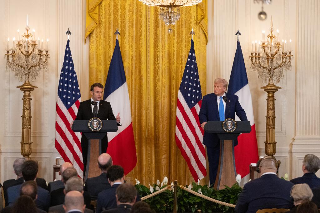2月24日,美國總統(tǒng)特朗普(右)在華盛頓白宮與到訪的法國總統(tǒng)馬克龍舉行會談后的聯(lián)合記者會。新華社記者胡友松攝