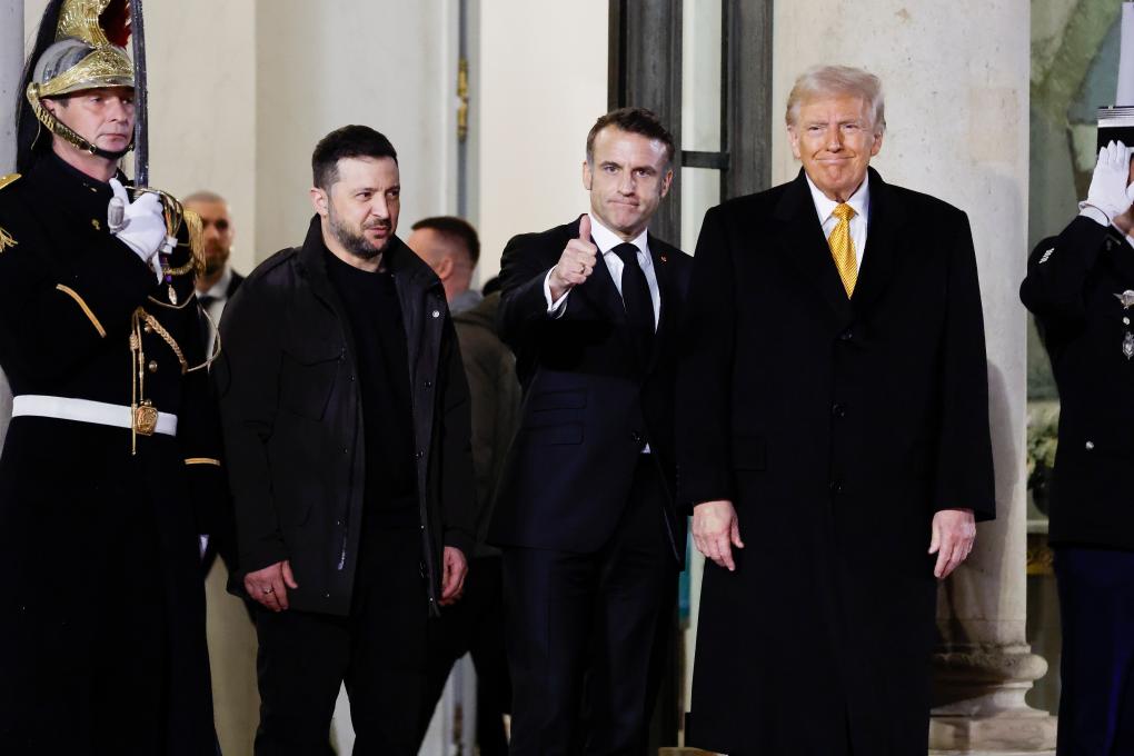 2024年12月7日,法國總統(tǒng)馬克龍(左三)與美國當(dāng)選總統(tǒng)特朗普(右)和烏克蘭總統(tǒng)澤連斯基(左二)會晤后走出愛麗舍宮。新華社發(fā)(亨利·施瓦茨攝)