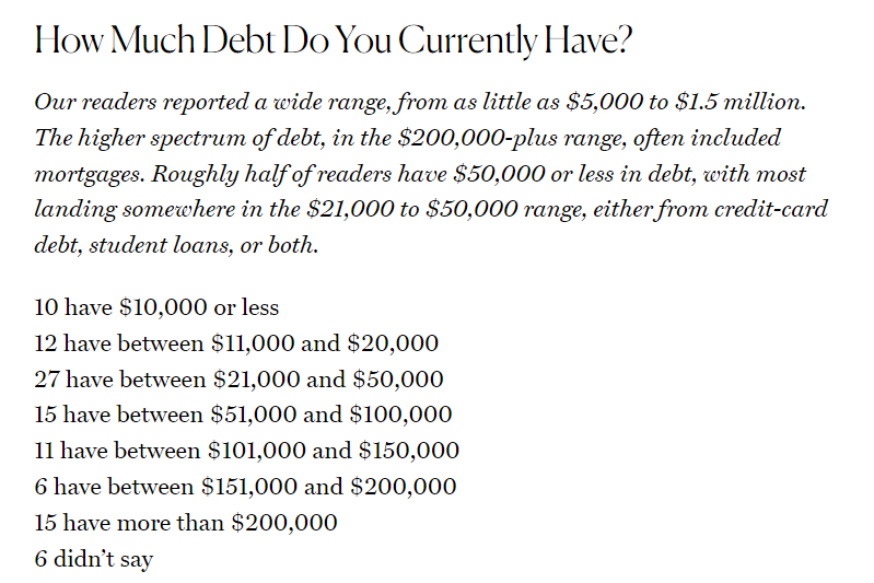 該網站針對102名讀者就個人債務問題進行了調查,了解他們如何背負和償還債務。調查發現,個人債務總額從5000美元到150萬美元不等,20萬美元以上的債務通常包含抵押貸款。約半數受訪者的債務在5萬美元及以下,最常見的債務范圍在2.1萬美元至5萬美元之間。