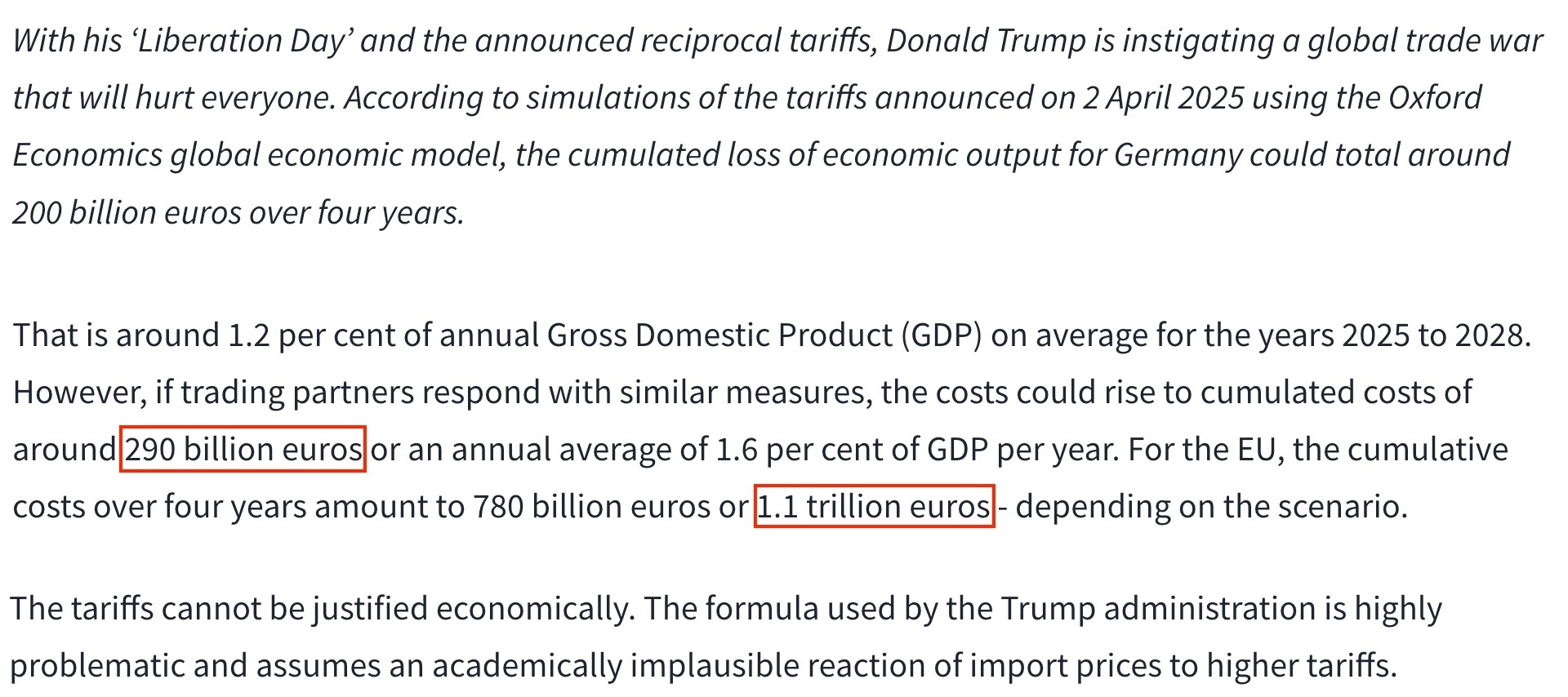 德國經濟研究所日前發布的研究報告顯示,未來四年內,美國“對等關稅”措施可能令歐盟損失1.1萬億歐元,僅德國就將損失2900億歐元。