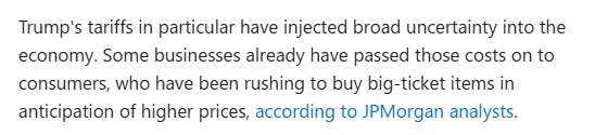 商界領(lǐng)袖們迫切希望美國的政策能有幾周的穩(wěn)定,美國農(nóng)戶們發(fā)現(xiàn)自己的聯(lián)邦食品補(bǔ)貼合同已經(jīng)終止,全美各地的非營利組織都在裁員,因?yàn)榘讓m正在削減開支。尤其是特朗普政府的關(guān)稅政策給經(jīng)濟(jì)帶來了廣泛的不確定性。摩根大通分析師表示,一些企業(yè)已經(jīng)將這些成本轉(zhuǎn)嫁給了消費(fèi)者,消費(fèi)者因預(yù)期價(jià)格上漲而搶購大件商品。