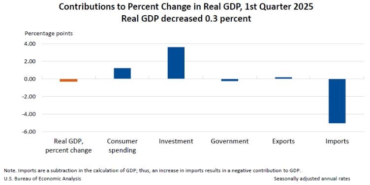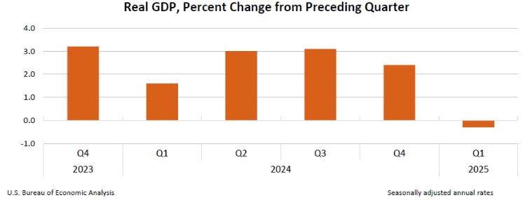 4月30日,美國商務(wù)部公布了2025年美國一季度經(jīng)濟(jì)數(shù)據(jù),美國一季度國內(nèi)生產(chǎn)總值環(huán)比(按年率計(jì)算)萎縮0.3%,為三年來首次負(fù)增長。
