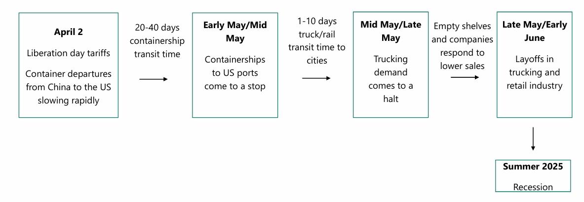 按其時間表所述,第一波次將在5月上旬至中旬發(fā)生。在經(jīng)歷三個階段后,在2025年夏季,美國經(jīng)濟(jì)陷入衰退,具體“四步走”的階段如下: