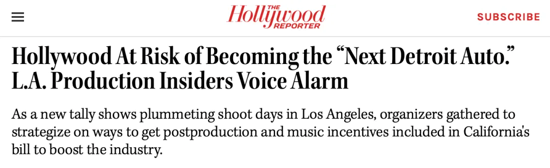 △《好萊塢報道者》發表題為《好萊塢或成為下一個底特律》的文章,指出好萊塢最后可能只剩一具空殼。