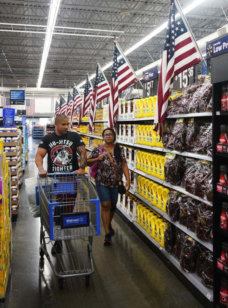 5月20日,顧客在美國加利福尼亞州洛杉磯縣一家沃爾瑪商店內采購商品。新華社發(邱晨攝)