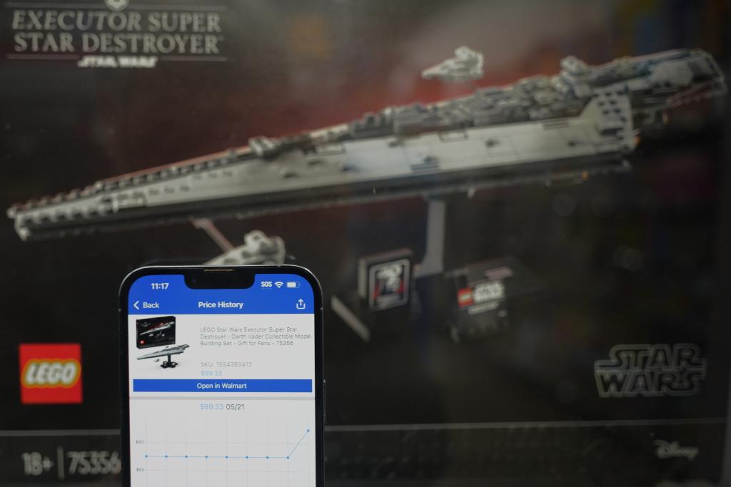 5月21日,在美國加利福尼亞州舊金山灣區圣萊安德羅的一家沃爾瑪超市,價格跟蹤軟件顯示一款星球大戰主題的樂高玩具售價變化情況。新華社記者 吳曉凌 攝