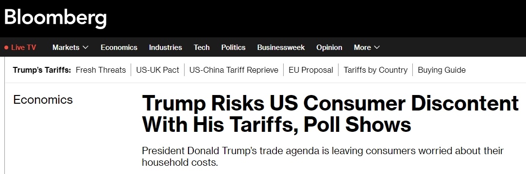 彭博社近日民調(diào)顯示,56%的受訪美國人認(rèn)為,特朗普對其他國家征收的關(guān)稅對他們的家庭財(cái)務(wù)狀況產(chǎn)生了不良影響。即使特朗普政府一直在鼓吹加關(guān)稅能讓產(chǎn)業(yè)回流美國并增加財(cái)政收入,約52%的受訪者還是表示,美政府承諾的好處不值得他們?yōu)榇烁冻龅慕?jīng)濟(jì)代價。
