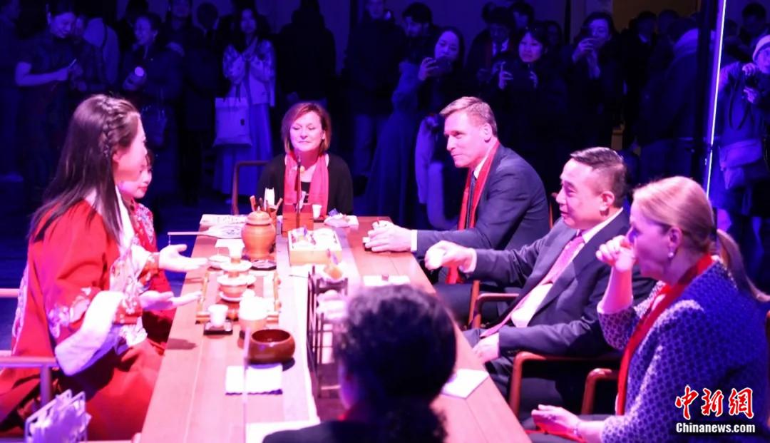 2025年2月13日,中國駐歐盟使團在布魯塞爾燈光節組織“光影茶榭”活動,中國駐歐盟使團團長蔡潤(右排圖中)邀請嘉賓品茗,體驗中國茶藝。中新社記者 德永健 攝