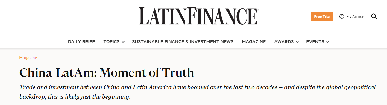 長(zhǎng)期關(guān)注拉美及加勒比地區(qū)發(fā)展的《拉美金融》雜志最近的一篇文章,聚焦了過(guò)去二十年拉丁美洲與中國(guó)之間貿(mào)易和投資的蓬勃發(fā)展。文章指出,盡管當(dāng)前全球地緣政治形勢(shì)復(fù)雜,但拉美與中國(guó)這種良好的發(fā)展勢(shì)頭可能僅僅是雙方合作的開(kāi)端。