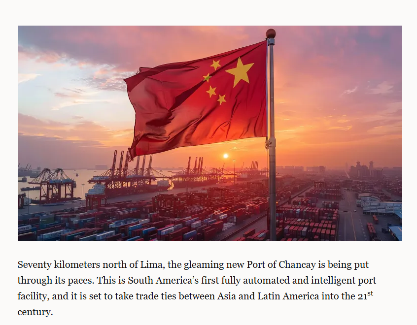 文章首先將目光投向在秘魯首都利馬以北70公里處的錢(qián)凱港。這個(gè)由中國(guó)和秘魯合作建設(shè)的嶄新港口,是南美洲首個(gè)全自動(dòng)智能化港口設(shè)施,它將把亞洲與拉丁美洲的貿(mào)易關(guān)系帶入21世紀(jì)。隨著通往該港口的跨大陸公路和鐵路連接完工,錢(qián)凱港不僅要處理涉及南美洲太平洋沿岸的進(jìn)出口貨物,也將處理從阿根廷、巴西和巴拉圭穿越太平洋運(yùn)往中國(guó)的牛肉、大豆和小麥等貨物。